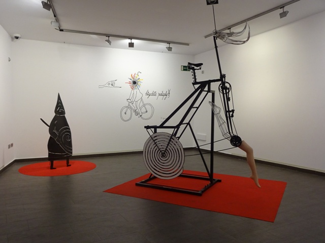 Ese día, el inaugural de la exposición, el protagonista era Fernando Arrabal, haciendo de sí mismo, interpretándose una vez más, histriónico como siempre aunque me pareció algo más moderado que en otras ocasiones. Él es todo un personaje, lo sabe y lo sabíamos también los espectadores. A su lado, Juan Carlos Valera hacía de anfitrión, quizá sin aprehender todavía cual es la exacta, enorme dimensión que para el conjunto de la cultura, también la de esta ciudad, tiene la obra portentosa que está llevando a cabo desde hace ya tantos años, la edición de Menú, una muy especial, delicada propuesta gastronómica, en la que se combinan muy variados ingredientes, versos, palabras sueltas, imágenes que hacen de esta selección de platos cocinados en frío un sabroso, siempre original e inesperado alimento para el espíritu. Allí, en la Sala Acua (calle del Colmillo, frente al Museo de Arte Abstracto, por si alguien todavía no lo sabe), esta singular exposición que yo no se si calificar de bibliográfica, de arte, de cocina o de qué, ofrece un inmenso espacio para la imaginación. En el centro, la Bicicleta Patafísica inventada por Arrabal, es el símbolo de este riquísimo menú. No explico lo que significa. En la pared hay un texto aclaratorio en el que se desmenuzan todos los ingredientes de este singular y estimulante alimento patafísico.