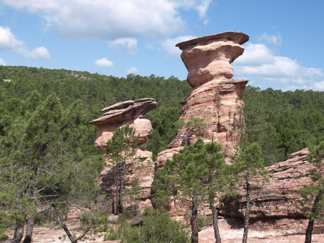 A medida que se avanza por el paraje es perceptible cómo se van dibujando esas grandes cresterías que constituyen un bosque de rocas caprichosas en su silencio de orgullo milenario. La acción del tiempo, la acumulación de cataclismos y erosiones ha ido forjando la desnudez de las placas pétreas que apoyadas una sobre otra asemejan un montón de libros apilados en equilibrio inestable. En el interior del bosque de piedras predominan las formas aisladas, solitarias, en las que se van dibujando figuras impresionantes, magníficas, por entre las que pasa silbando el suave viento serrano envuelto en sonidos de mágicas resonancias. Pequeños robles conviven con los altos pinos laricios. Un rico sotobosque forma la superficie sobre la que se deslizan pequeños hilos de agua, nacidos quien sabe dónde. Como tampoco tiene un origen estable el rumor del aire circulando libremente a través de las rocas y los árboles. No falta en el paraje el ingrediente histórico, un campo de túmulos funerarios de épocas perdidas en la oscuridad de los tiempos.