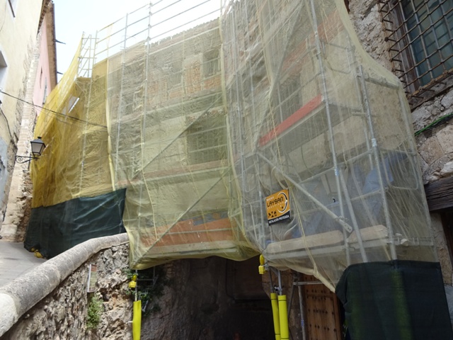 Da un poco de grima contemplar cómo se encuentra ahora el edificio más emblemático de Cuenca, el que sintetiza el espíritu de la ciudad, al menos de puertas para afuera, el más fotografiado, con mucha diferencia sobre cualquier otro. No hay mayor reclamo turístico que las Casas Colgadas y más aún si se las pone en relación con el vecino Puente de San Pablo, formando ambos elementos el paradigma simbólico que tanto atrae a nuestros visitantes y, a lo mejor, incluso a los propios conquenses. Los aficionados a fotografiar el venerable edificio tienen ahora una mala época; si acaso, queda un leve resquicio en los ventanales que se asoman a la hoz del Huécar pero el resto del inmueble se encuentra como vemos, envuelto en la imprescindible malla protectora que oculta lo que está pasando en el interior, una situación que invita, naturalmente, a las más arriesgadas elucubraciones. Porque cabe preguntarse qué está ocurriendo ahí dentro, que están haciendo, cómo nos lo van a devolver, al menos la parte, importante, que está siendo remodelada, que la otra, la del Museo, sí está visible y visitable. Pero el otro sector del edificio, el que fue famoso y apetecido restaurante, el sitio al que era imprescindible acudir para cualquier celebración de postín (incluso, por ejemplo, si unos príncipes recién casados venían a Cuenca durante su viaje de bodas), ese lleva ya cancelado y en mísera posición de abandono una eternidad.