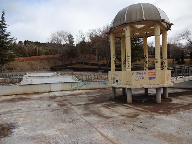 Eso que se ve en la imagen son tres piletas, o como decía el documento original que lo definió, un estanque repartido entre tres niveles, con un templete chinesco que dará la impresión de estar flotando sobre el agua, por la que caminarían alegremente patos deslizándose entre plantas acuáticas. Ese elemento iba a ser el más representativo y definitorio del nuevo parque que tendría, además, una gran plaza donde se había previsto levantar una escultura, mientras que en la parte más alta existiría una explanada en la que se pensaba habilitar un mirador orientado hacia el sur, desde el que sería posible contemplar una amplia panorámica de la parte nueva de Cuenca. Por supuesto, como corresponde a un parque que se precie, habría abundantes paseos, parterres con césped, una amplia zona de juegos infantiles y todos los aditamentos propios de estos casos. De los deseos a la realidad va la misma distancia que va del cero al infinito.