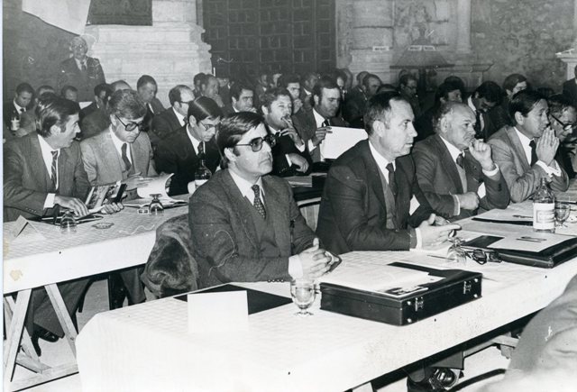 No está de más, creo, recordar que el primer paso se dio en Mota del Cuervo, a donde acudieron parlamentarios de las cinco provincias animados con el solo pensamiento de que algo había que hacer. Empezaba la democracia a recorrer su camino, las regiones históricas ya avanzaban con paso firme para conseguir lo que llevaban intentando durante siglos y el resto del país ante la perspectiva de quedarse fuera o atrás (que quizá viene a ser lo mismo) reaccionó buscando también algo similar. A trompicones empezó al rosario de reuniones y ahí es donde se van mezclando los recuerdos. En los inicios, se hicieron algunas en el salón rojo de la Diputación de Cuenca y allí, en los debates estatutarios, empezó a despuntar la verborrea de un joven abogado de Albacete, José Bono, que en seguida tomó la delantera en planteamientos dialécticos; podría decirse que era de los pocos que sabía bien lo que quería mientras la mayoría de los demás se dejaba llevar por los acontecimientos, con más dudas que certezas sobre lo que estaban haciendo. Es inevitable recordar el frío intenso de la iglesia de Santa María, en Alarcón, donde finalmente se aprobó el Estatuto de Autonomía, que debería haber merecido el calor popular suficiente para envolver al menos en afectos el que debió ser un día histórico. La foto que precede a estar líneas recoge la presencia de los parlamentarios conquenses en aquel acto.